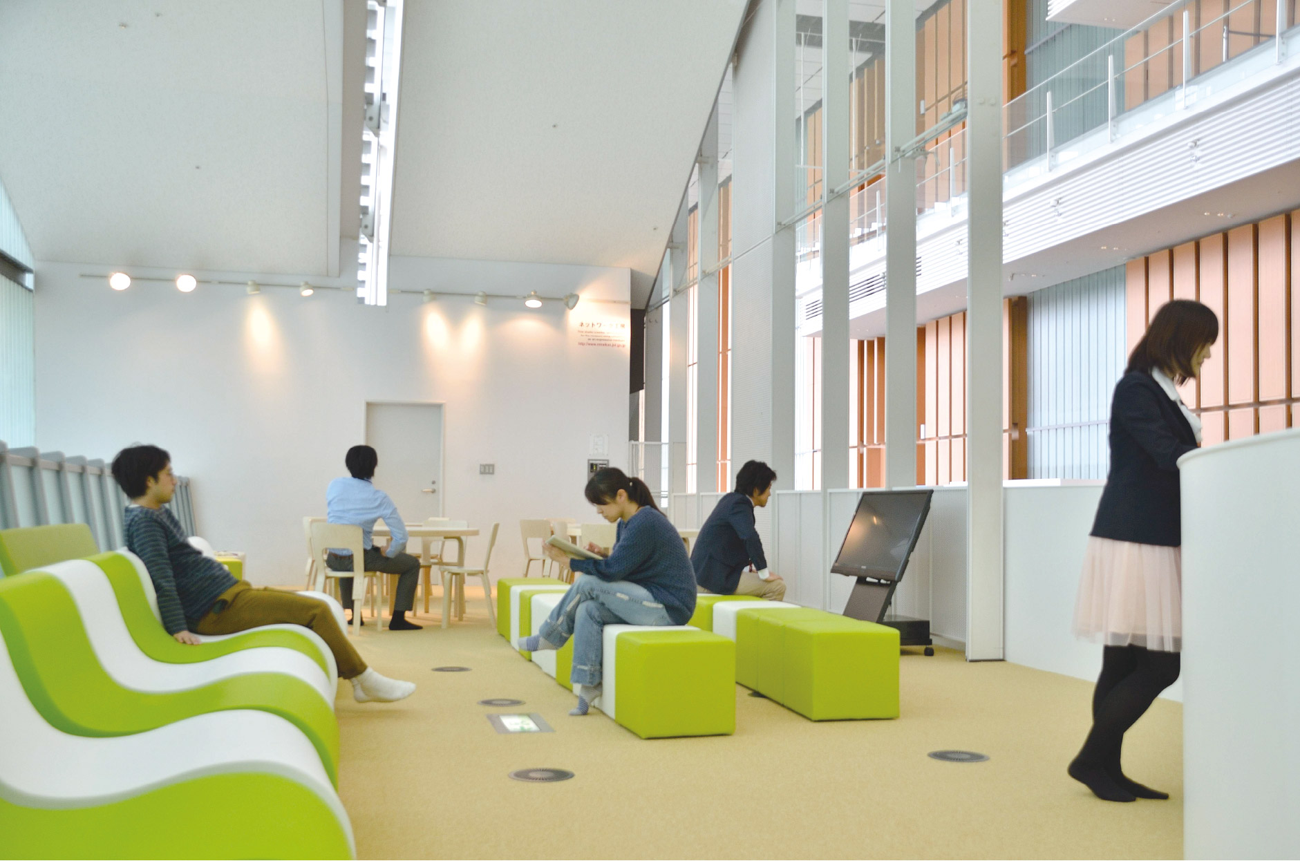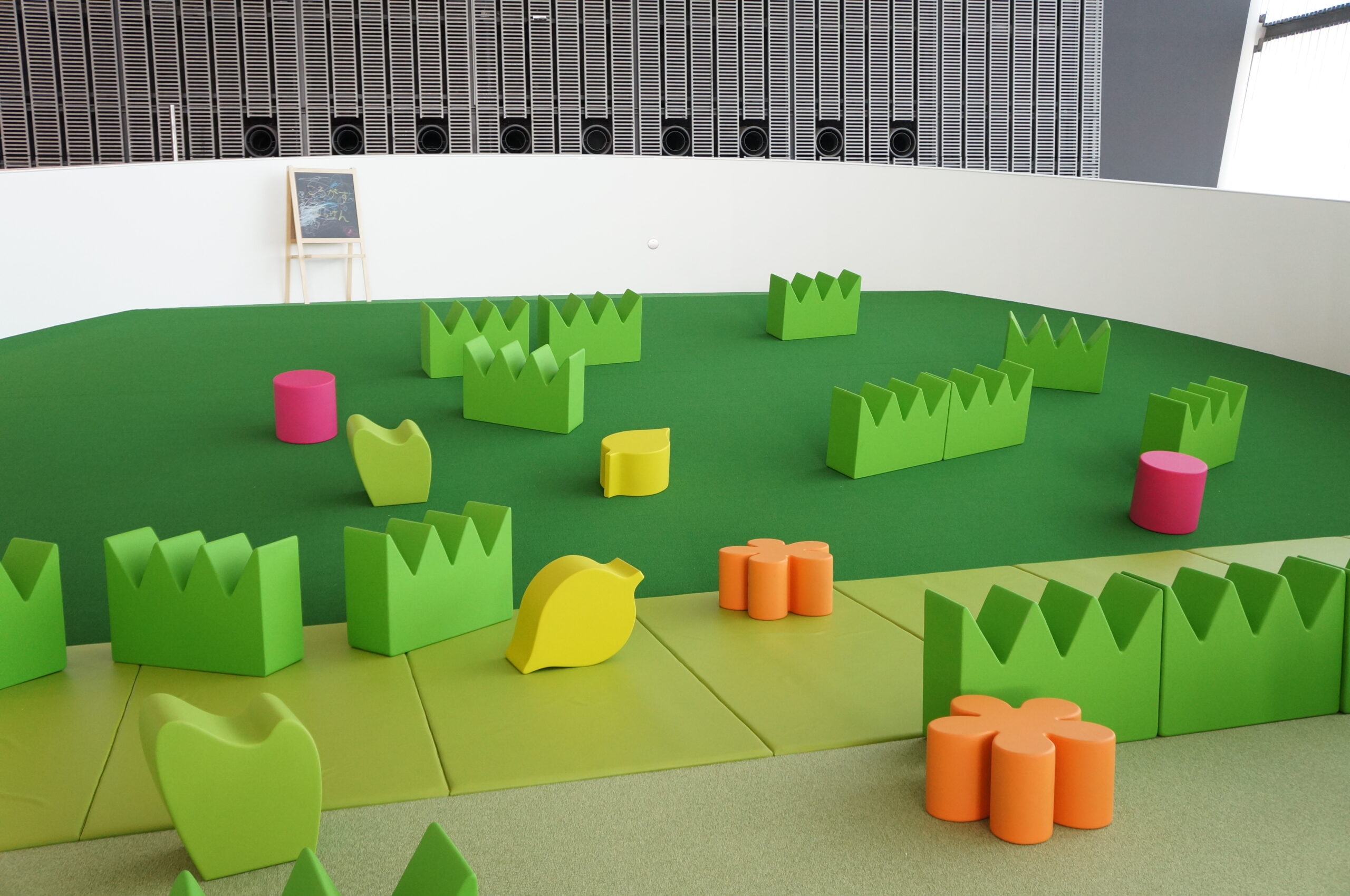 おや?っこひろば 靴を脱いで入る、開放感あふれる空間で す。人工芝の坂で大きさや形、素材の違う ボールや草花のオブジェを転がしたり落 としたりしながら、たくさんの「ハテナ」を 発見していきます。休憩スペースにはゆっ たり座れるソファも。